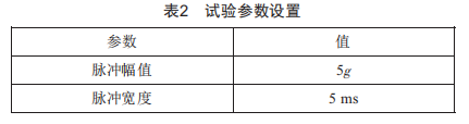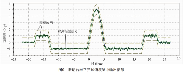 本次試驗選用半正弦脈沖形式,圖9為振動臺實際輸出的波形圖,其中淺綠色波形表示在控制軟件中設(shè)置的理想波形,深綠色波形表示實測輸出信號??梢钥闯?振動臺實際輸出的加速度脈沖激勵與設(shè)定值吻合較好,對于試驗中設(shè)定的不同脈沖寬度、脈沖幅值、脈沖激勵形式均能按照設(shè)定值進行加載。