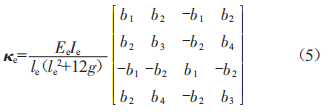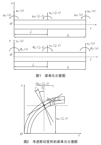 圖1中,每個單元包含2個節(jié)點,每個節(jié)點4個自由度,分別為x、y方向的平移自由度和繞x、y軸的轉(zhuǎn)動自由度。x、y方向的平動位移分別用u和0表示:繞x、y軸的角位移分別用o和9表示:x:z平面上,y軸垂直紙面向外:y:z平面上,x軸垂直紙面向里:下標e1、e2分別表示單元的第1個節(jié)點、第2個節(jié)點:1e表示單元的長度:為0~1e中間任意一點。