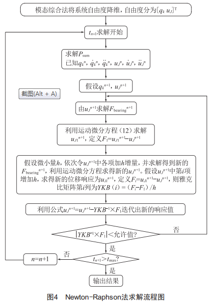 式(12)中的項Fbearing是與位移相關(guān)的非線性力項,因此式(12)為非線性方程組。對于非線性方程組,通常有不動點迭代法和NeWton-Raphson法。NeWton-Raphson法與不動點迭代法相比計算較為復(fù)雜,但由于其在方程根附近為平方收斂,因此具有收斂速度快的優(yōu)點。本文選用NeWton-Raphson法進行微分方程求解,求解流程如圖4所示。