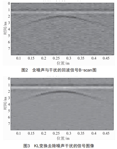 由于地下噪聲源是隨機(jī)的,而目標(biāo)在0.15~0.4m位置之間的測(cè)量數(shù)據(jù)是關(guān)聯(lián)的,因此使用上述KL變換方法,能較好地去除圖中噪點(diǎn),還原目標(biāo)信息,如圖3所示。此外,在去除了噪聲干擾后,目標(biāo)信息有一定程度的增強(qiáng)。