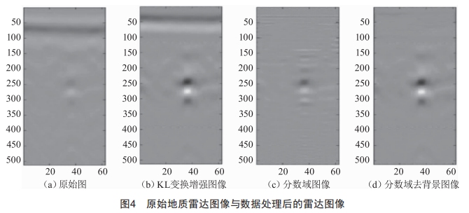 為了進(jìn)一步去除探地雷達(dá)無損探測(cè)中的直達(dá)波并增強(qiáng)目標(biāo)回波信號(hào),本文結(jié)合KL變換與分?jǐn)?shù)域分析,對(duì)采集到的原始回波圖像進(jìn)行KL變換,提取目標(biāo)特征參數(shù),重構(gòu)出目標(biāo)信號(hào)增強(qiáng)的圖像,再通過分?jǐn)?shù)域轉(zhuǎn)換,獲得適合目標(biāo)凸顯而直達(dá)波被抑制的處理圖像,有利于目標(biāo)信號(hào)識(shí)別與提取。