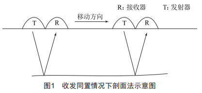 剖面法的測(cè)量結(jié)果以B-scan方式呈現(xiàn),測(cè)點(diǎn)的位置在圖像橫坐標(biāo)中體現(xiàn),而縱坐標(biāo)記錄了每一個(gè)測(cè)點(diǎn)數(shù)據(jù)的回波雙程時(shí)間。在實(shí)際應(yīng)用中,常采用收發(fā)同置天線,即發(fā)射天線與接收天線在同一測(cè)點(diǎn)發(fā)射電磁波、接收回波。圖1為收發(fā)同置天線情況下剖面法示意圖。
