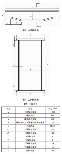 橋式起重機(jī)橋架主要由主梁、端梁、欄桿、走臺(tái)、軌道和操作室等構(gòu)件組成。起重機(jī)主梁的主體是由上下翼緣板和左右腹板焊接而成的箱形梁,主梁內(nèi)部均勻設(shè)置了加勁板,加勁板在起重機(jī)工作時(shí)可以承受部分負(fù)載來維持箱體形狀,以滿足主梁的穩(wěn)定性要求。