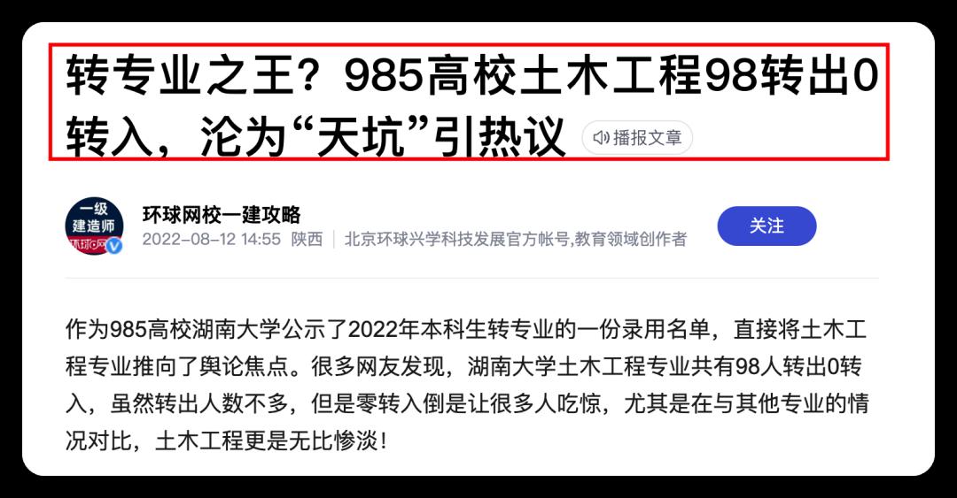 上上周我記得看了一個(gè)新聞,湖南大學(xué)土木工程大一轉(zhuǎn)專(zhuān)業(yè)的98轉(zhuǎn)出0轉(zhuǎn)入。
