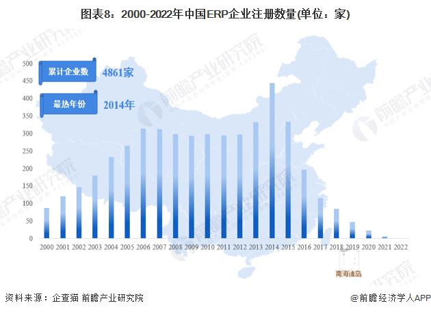 根據(jù)中國企業(yè)數(shù)據(jù)庫企查貓,目前中國ERP行業(yè)的主要企業(yè)共有4861家,其中以2014年為主要注冊熱潮,2014年注冊企業(yè)數(shù)量為443家,而后注冊企業(yè)數(shù)量有下滑趨勢。目前企業(yè)數(shù)量較為穩(wěn)定。