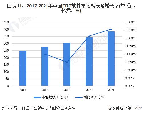 ——中國ERP軟件市場規(guī)模逐年擴大近年來,隨著企業(yè)對管理水平的日益重視,越來越多的企業(yè)將目光投向ERP軟件市場,希望通過ERP系統(tǒng)的建設增強企業(yè)的綜合競爭力,從而推動了國內(nèi)ERP軟件市場的穩(wěn)定增長。根據(jù)阿里云創(chuàng)新中心發(fā)布的《2021中國工業(yè)軟件發(fā)展白皮書》,中國經(jīng)營管理類工業(yè)軟件市場規(guī)模不斷擴大,其細分市場包括企業(yè)資源計劃(ERP)軟件市場、設施管理(FM)軟件市場、供應鏈管理(SCM)軟件市場等,其中ERP市場占據(jù)了經(jīng)營管理類工業(yè)軟件市場85%的市場份額,中國ERP軟件市場較為成熟,目前已經(jīng)涌現(xiàn)出一批高質(zhì)量的軟件企業(yè),國產(chǎn)軟件在具備一定市場規(guī)模的基礎上。2017-2021年,我國ERP軟件市場規(guī)模一直處在增長的趨勢,但隨著ERP軟件廠商第一波推廣熱潮逐漸褪去,且如今ERP軟件要求高度契合行業(yè)業(yè)務特點進行開發(fā),因此普及速度不及通用性產(chǎn)業(yè),近年行業(yè)整體僅保持中高速發(fā)展。2018-2019年中國ERP軟件市場規(guī)模的增速出現(xiàn)放緩,但仍維持在10%以上。2021年,中國ERP市場規(guī)模約為385億元,同比增長12.57%。