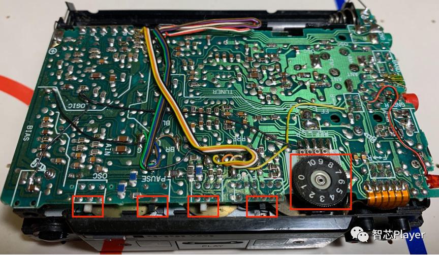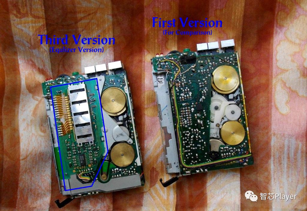 ????先給出了HS-P7第一代,第二代,第三代內(nèi)部電路板的對(duì)比,可以看到大同小異。標(biāo)識(shí)出了撥碼盤,按鍵以及耳機(jī)充電器的位置,其中飛線應(yīng)該是電池的線了。可以看到在當(dāng)時(shí)這個(gè)電路板工藝做地還是很到位的。除此以外,隨身聽的主結(jié)構(gòu)件也給了特寫,可以看到是鈑金沖壓工藝后氧化,最后給出了隨身聽磁頭的特寫。