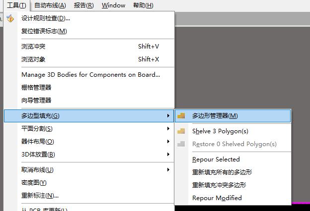 2、新網(wǎng)絡(luò)添加完成之后,我們需要添加以板框形狀創(chuàng)建的多邊形鋪銅。打開銅皮管理器,如下圖27所示。在彈出的銅皮管理器對話框中,點擊“從...創(chuàng)建新的多邊形”選擇“板外形”,如下圖28所示。點擊右邊彈出對應(yīng)的銅皮屬性設(shè)置框,將此銅皮賦予之前創(chuàng)建的新網(wǎng)絡(luò)“T1”,將銅皮放置于“BOTTOM”層,設(shè)置如下圖29所示。