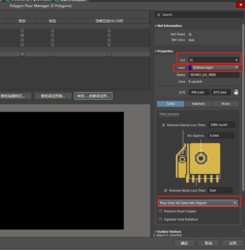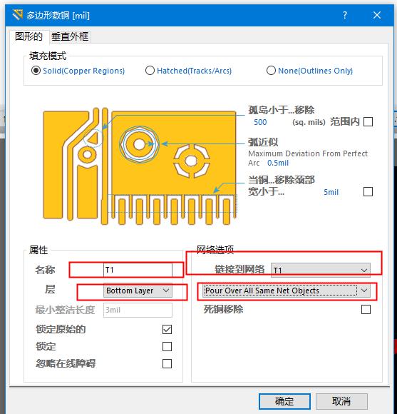 3、點擊彈出對應(yīng)的銅皮屬性設(shè)置框,將此銅皮賦予之前創(chuàng)建的新網(wǎng)絡(luò)“T1”,將銅皮放置于“BOTTOM”層,設(shè)置如下圖7所示,此時可以看到PCB中已在底層鋪上銅皮,如下圖8所示: