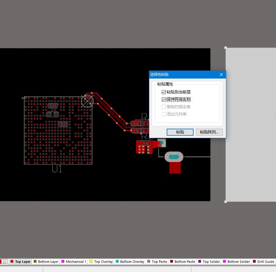3、選中將此銅皮通過智能粘貼的方法粘貼到頂層?!癱trl+c”光標找到基準點點擊進行粘貼,如下圖31所示。切換到頂層,然后快捷鍵”EA”,彈出“選擇性粘貼”對話框選項設(shè)置如下圖32所示: