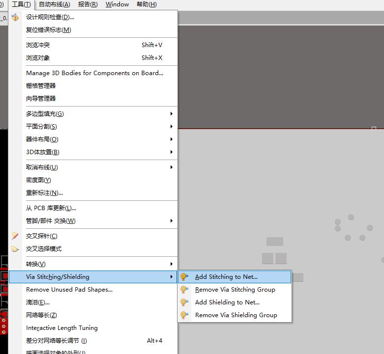 7、選中頂層銅皮,執(zhí)行命令“工具-縫合孔-給網(wǎng)絡(luò)添加縫合孔”如下圖15所示: