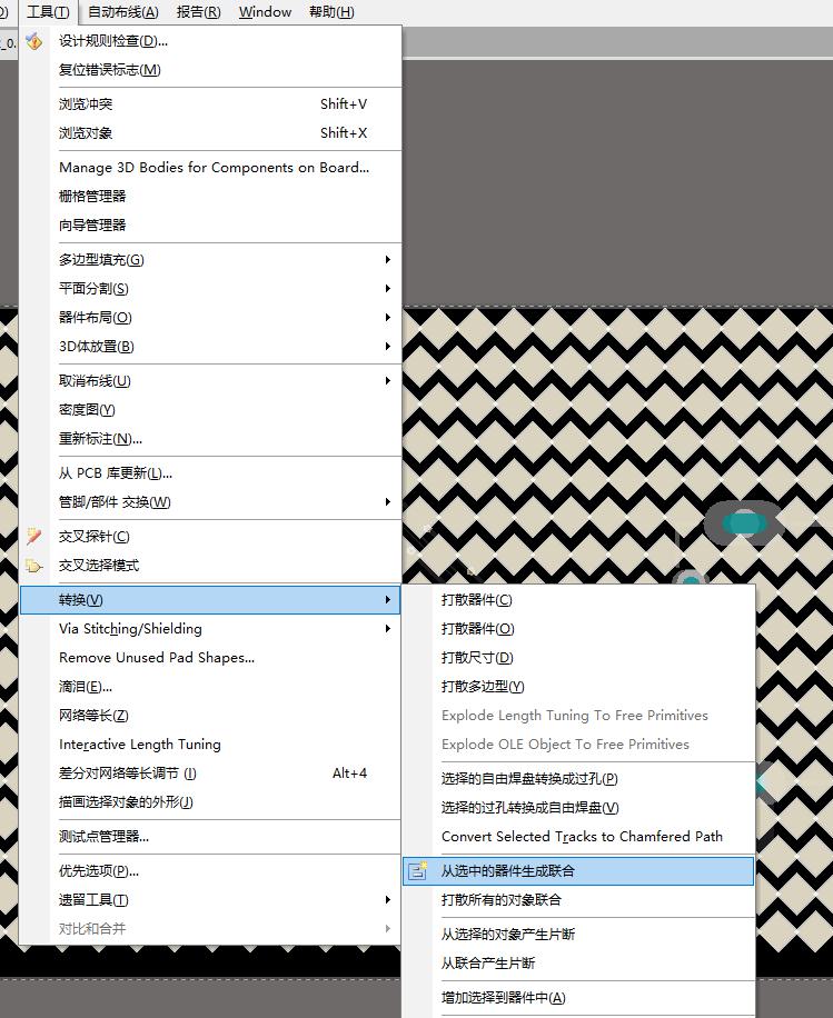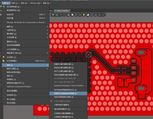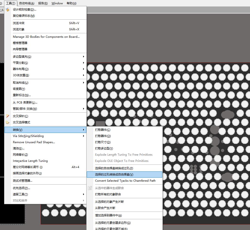 8、將此縫合孔全部選中之后,將其全部轉(zhuǎn)換成自由焊盤。選中縫合孔執(zhí)行命令“工具-轉(zhuǎn)換-選擇的過孔轉(zhuǎn)換成自由焊盤”或者是快捷鍵“TVV”,如下圖17所示。