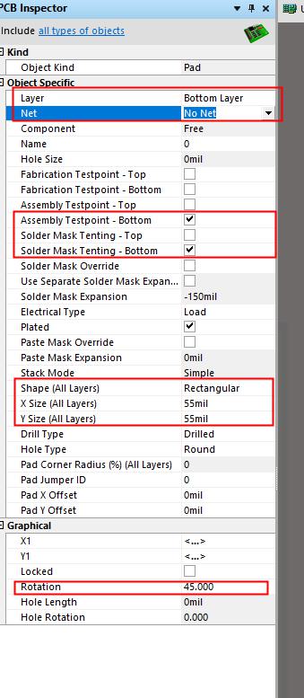 轉(zhuǎn)換成功后,對應(yīng)自由焊盤被全部選中以及會彈出屬性框,對應(yīng)屬性框設(shè)置有將焊盤放置于底層,焊盤形狀由圓形改為矩形,旋轉(zhuǎn)45度使矩形變成菱形,網(wǎng)絡(luò)設(shè)置為無網(wǎng)絡(luò)。如下圖38所示。