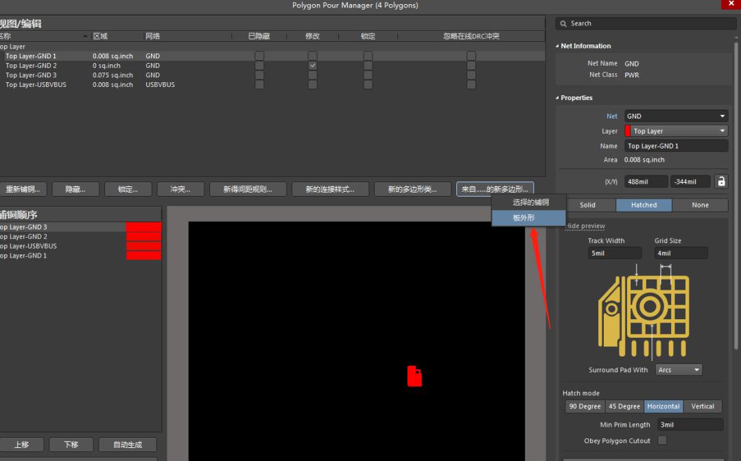 2、新網(wǎng)絡(luò)添加完成之后,我們需要添加以板框形狀創(chuàng)建的多邊形鋪銅。打開銅皮管理器,如下圖5所示,在彈出的銅皮管理器對話框中,點擊“從...創(chuàng)建新的多邊形”選擇“板外形”,如下圖6所示: