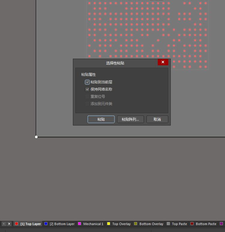 6、底層銅皮移出板外之后,選中將此銅皮通過智能粘貼的方法粘貼到頂層。“ctrl+c”光標找到基準點點擊進行粘貼,如下圖11所示。切換到頂層,然后快捷鍵”EA”,彈出“選擇性粘貼”對話框選項設(shè)置如下圖12所示: