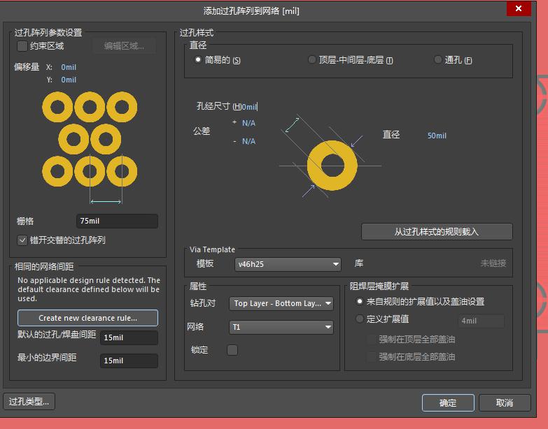 彈出“添加過孔陣列到網(wǎng)絡(luò)”對話框,將網(wǎng)絡(luò)設(shè)置為新添加的“T1”,柵格按照自己需要的進行設(shè)置即可,設(shè)置完成之后點擊“確定”,如下圖16所示,此時頂層銅皮的縫合孔已經(jīng)添加完成。