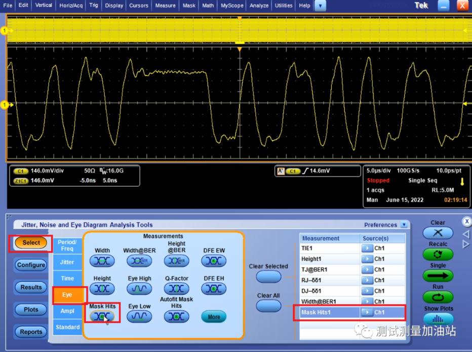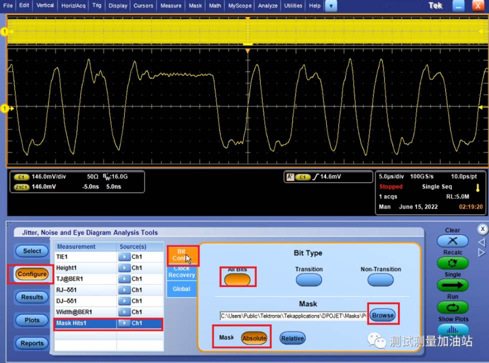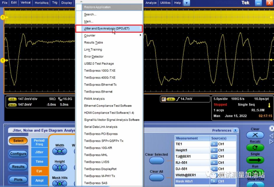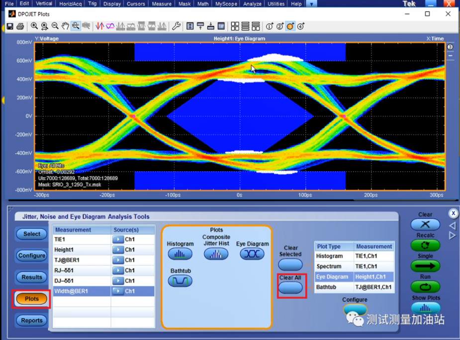 Step1: 點(diǎn)擊analyze→Jitter and Eye Analysis→One Touch jitter進(jìn)行抖動(dòng)眼圖測試,示波器會(huì)自動(dòng)進(jìn)行抖動(dòng)眼圖分析,見下圖。