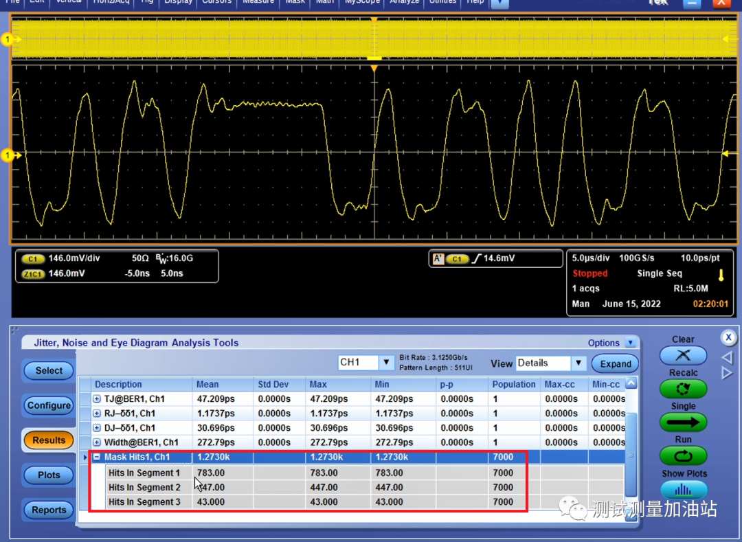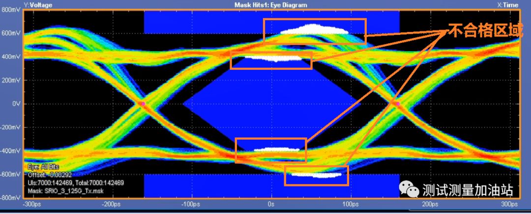 模板通常限定了信號(hào)不合格區(qū)域,如果眼圖與模板相交違規(guī),眼圖軟件會(huì)標(biāo)注不合格區(qū)域,該部分波形跡線將顯示為白色。見下圖。此外示波器將計(jì)算違規(guī)hits數(shù)量,并標(biāo)出是哪個(gè)Segment違規(guī)。