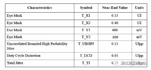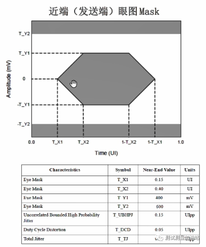 眼圖模板根據(jù)芯片電氣特性規(guī)格定義的,下面是某個(gè)高速串行信號(hào)標(biāo)準(zhǔn)的眼圖模板定義規(guī)范指標(biāo),通過模板規(guī)范指標(biāo),可以推導(dǎo)出了眼圖模板的t和y的參數(shù),用記事本編輯,然后存為.msk模板文件,最后利用DPOJET導(dǎo)入使用。