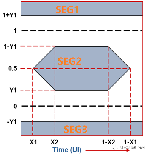 眼圖模板一般由上、中、下三部分組成,我們把最上邊的稱為Segment1,簡稱SEG1,一般為長方形;中間部分的稱為Segment2,簡稱SEG2,一般為菱形或六邊形;最下邊的稱為Segment3,簡稱SEG3,一般是長方形。