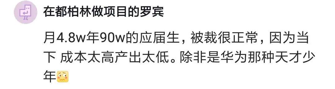 有人覺得應(yīng)屆生被裁很正常,成本太高,產(chǎn)出太低,能力匹配不上薪資,給高工資浪費(fèi)資源,公司這是及時(shí)止損。