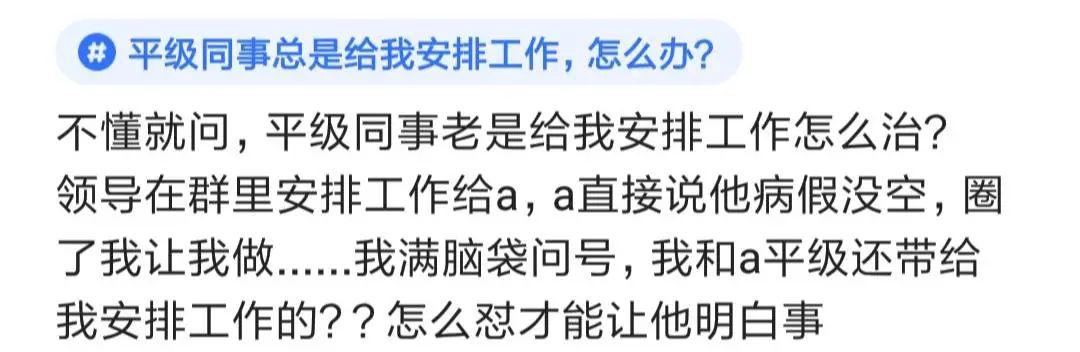 職場常見問題之一:平級同事總是給自己安排工作,怎么辦?這是一位網(wǎng)友的遭遇:領(lǐng)導(dǎo)在群里安排工作給a,a卻說請病假?zèng)]空,讓他做,但a和他平級,怎么懟才能讓a明白?