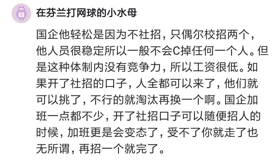有人說,國企輕松是因為不社招,人員穩(wěn)定,但沒有競爭力,所以工資很低。如果國企開了社招的口子,可以隨便招人,加班會更變態(tài)。