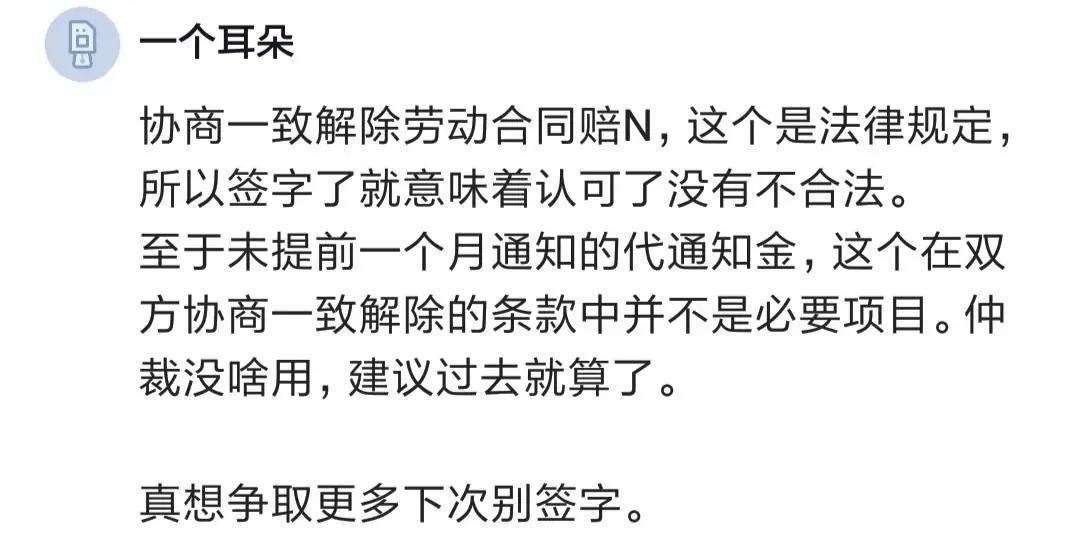 有人說,協(xié)商一致解除勞動(dòng)合同賠償N,這是法律規(guī)定,簽字了就意味著認(rèn)可了,至于代通知金并不是必要項(xiàng)目,仲裁也沒用。真想爭取,下次別簽字。