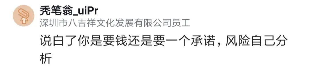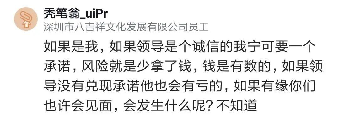 還有人覺(jué)得這是要錢(qián)還是要承諾的選擇,如果領(lǐng)導(dǎo)是個(gè)誠(chéng)信的人,自己寧愿要一個(gè)承諾,風(fēng)險(xiǎn)就是少拿錢(qián)而已。