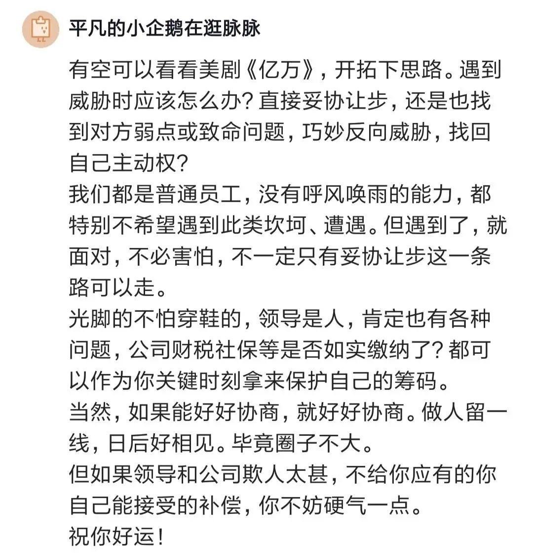 一位網(wǎng)友說(shuō),雖然大家都是普通員工,但也不要怕。遇到威脅不一定要妥協(xié)讓步,可以利用對(duì)方的弱點(diǎn)作為保護(hù)自己的籌碼。如果對(duì)方欺人太甚,就硬氣一點(diǎn)。當(dāng)然如果能好好協(xié)商最好,畢竟圈子不大,做人留一線,日后好相見(jiàn)。
