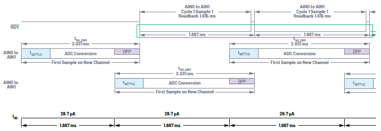 對于在多個(gè)通道上執(zhí)行一次轉(zhuǎn)換的多路復(fù)用ADC,在所有通道上執(zhí)行轉(zhuǎn)換所需的時(shí)間(包括建立時(shí)間等)稱為吞吐速率。