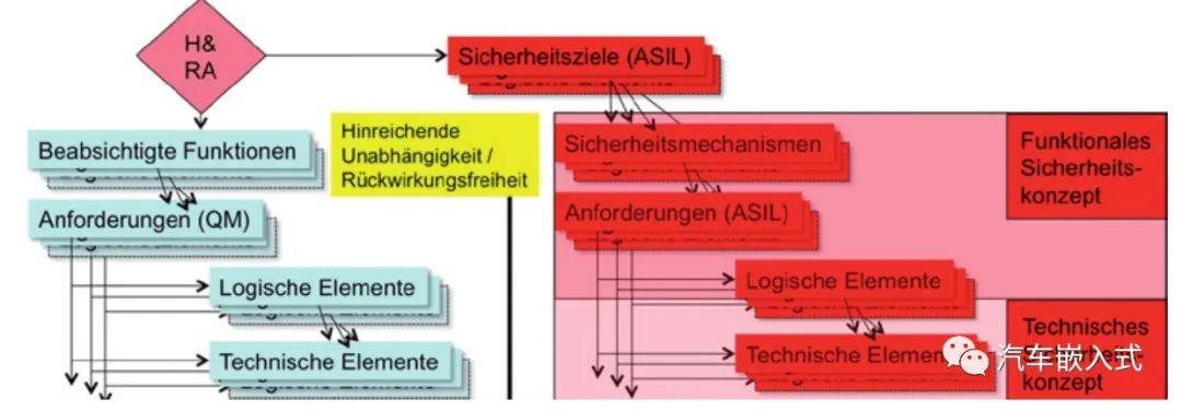 功能安全需求會(huì)帶著自身的安全等級(jí)屬性分配到不同的子系統(tǒng)中。而這里的功能安全需求不同于普通的功能需求,有很多特殊的地方,ISO在功能安全需求的來源和功能安全需求的分配上,有一定的建議和要求。