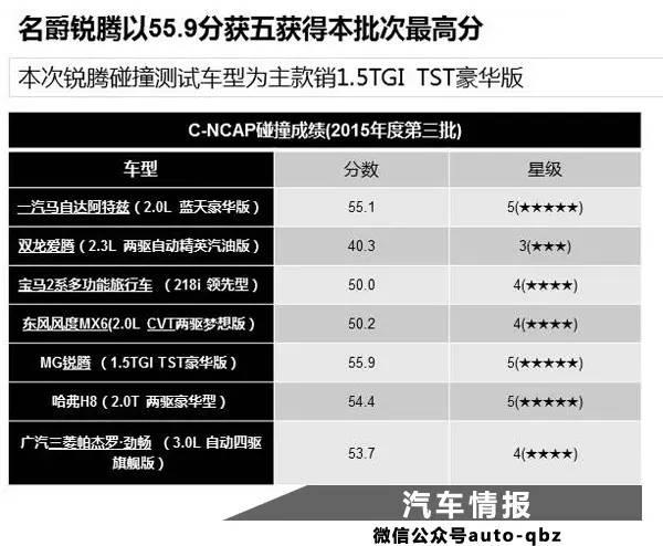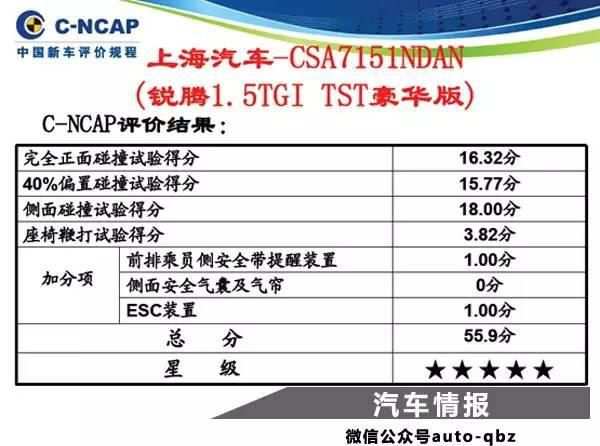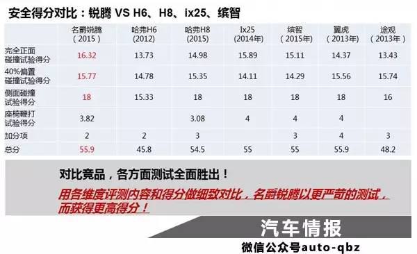 早在2015年9月11日,中國汽車技術研究中心發(fā)布了2015年度C-NCAP第三批車型評價結果。本次發(fā)布的結果共涉及7個車型,其中包括1個A類車、1個B類車、5個SUV車型。在SUV車型中,接受碰撞試驗銳騰1.5T豪華版以55.9分成績名列第一,獲得五星安全稱號。
