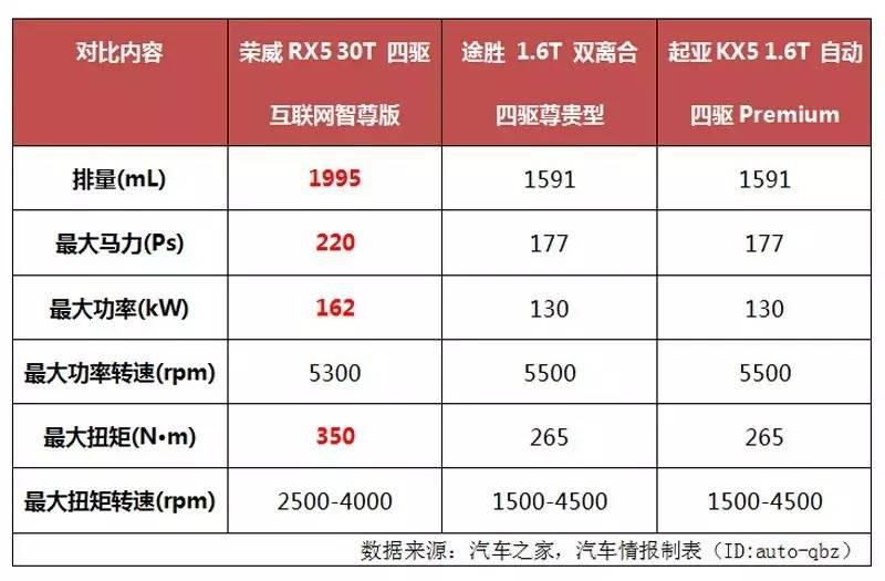 還是老規(guī)矩,先上數(shù)據(jù),用事實(shí)說話。從最大馬力、最大功率和最大扭矩這些核心參數(shù)上看,榮威RX5領(lǐng)先對(duì)手大半個(gè)身位,優(yōu)勢十分明顯。反觀途勝和起亞的1.6T渦輪增壓發(fā)動(dòng)機(jī),與RX5相比,就有點(diǎn)小巫見大巫了,如果放在載重低的轎車上,似乎還說得過去,可是偏偏用在了一輛自重約1.5噸的SUV身上,怎么看都有種小馬拉大車的感覺。