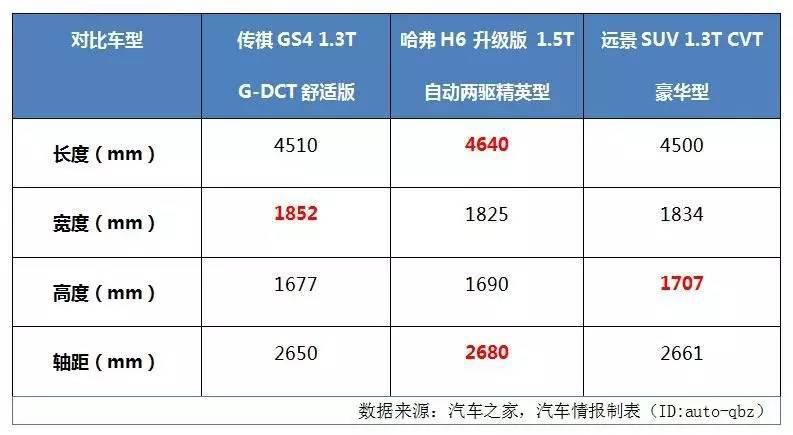 就車身參數(shù)上看,傳祺GS4、哈弗H6和遠景SUV三者不分伯仲,各有優(yōu)勢。哈弗H6憑借長車身、長軸距勝出,傳祺GS4則是在寬度上取得領(lǐng)先優(yōu)勢,而遠景SUV在高度上無人能敵,也可能更適合大塊頭的駕乘者。