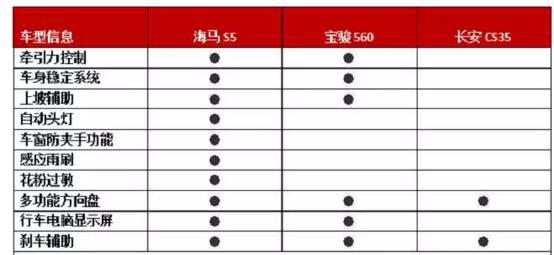 此外,海馬S5還獨(dú)具自動(dòng)空調(diào)、副駕駛四向電動(dòng)調(diào)節(jié)、車(chē)內(nèi)花粉過(guò)濾等寶駿560、長(zhǎng)安CS35這兩款車(chē)型所不具備的功能,為消費(fèi)者提供了極大的便利性。