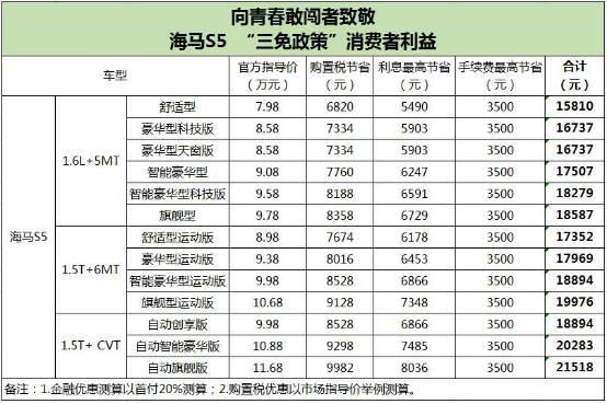據(jù)海馬汽車(chē)“向青春敢闖者致敬 海馬S5三免誠(chéng)意金融禮遇政策”顯示,購(gòu)買(mǎi)海馬S5全系車(chē)型,均能享受購(gòu)置稅100%減免的優(yōu)惠,而如果選擇貸款購(gòu)車(chē),還能享受兩年免利息的金融禮遇,如果再加上3500元購(gòu)車(chē)手續(xù)費(fèi)減免,最高可節(jié)省21518元購(gòu)車(chē)成本,相當(dāng)于用3個(gè)iPhone7了有沒(méi)有?。?!就問(wèn),還有誰(shuí)!