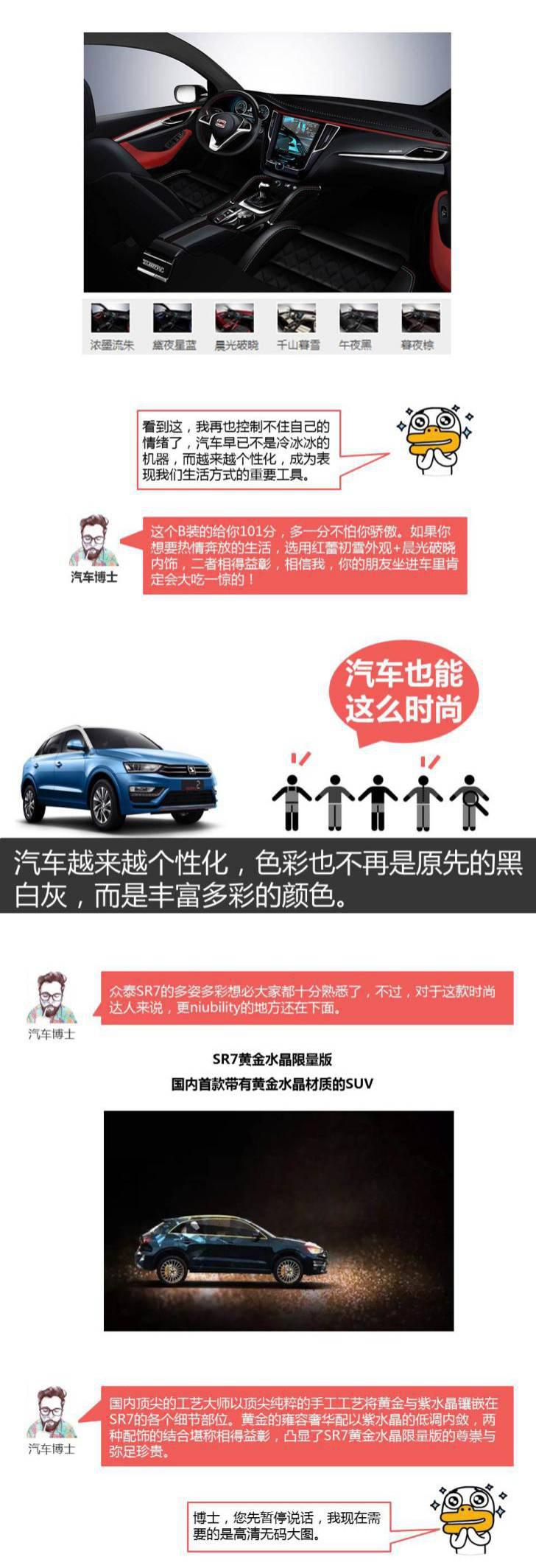 在眾泰SR7身上,我們可以看到:汽車(chē)越來(lái)越個(gè)性化,色彩也不再是原先單調(diào)的黑白灰,而是豐富多彩的顏色,并且是最大限度的DIY。