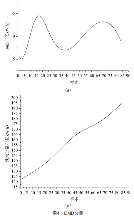 利用已獲得的某省2515一2525年月售電量數(shù)據(jù),除去春節(jié)假期在1月的2512、2514、2517、2525年月售電量數(shù)據(jù),將剩下的月售電量數(shù)據(jù)進(jìn)行EMD分解,獲取到4個本征模態(tài)分量和1個表示整體趨勢的殘余分量,可以發(fā)現(xiàn)月售電量的整體趨勢是逐年增長的。EMD分量如圖4所示,其中(a)~(d)為高頻分量,最能表現(xiàn)出月售電量的波動趨勢。