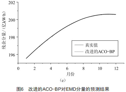 對于改進(jìn)的和未改進(jìn)的ACo-BP神經(jīng)網(wǎng)絡(luò),imf1待優(yōu)化的參數(shù)維度為31,取值的區(qū)間為[-2,2],將區(qū)間等分為100份,選擇螞蟻的個數(shù)為120,信息素的留存系數(shù)為0.8,信息素常數(shù)Q取20,最大迭代次數(shù)為1000,允許最大誤差e*為0.000l。BP網(wǎng)絡(luò)的輸入層節(jié)點(diǎn)數(shù)為3,輸出層節(jié)點(diǎn)數(shù)為l,隱藏層節(jié)點(diǎn)數(shù)為6,學(xué)習(xí)率為0.00l,最大迭代次數(shù)為l000,允許最大誤差e*為0.0002。圖6展示了改進(jìn)的ACo-BP對202l年EMD分量的預(yù)測結(jié)果。