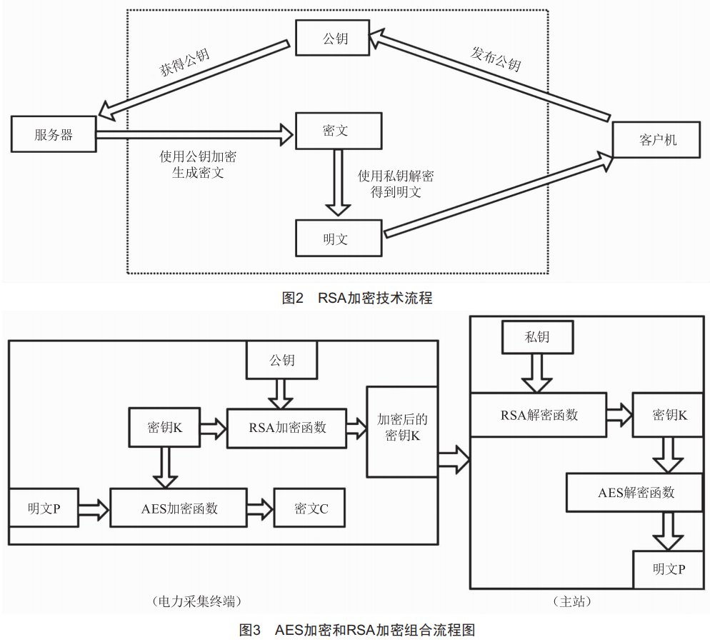 對AES加密技術(shù)和RSA加密技術(shù)的特點進行分析可知,RSA加密效率比較低,不適用于對大量數(shù)據(jù)進行加密,然而,電力采集終端設(shè)備生成的報文所占空間比較大,很顯然只適合使用AES加密技術(shù)進行加密。因此,可以使用RSA和AES組合的方法對報文進行加密傳輸。使用AES對電力采集終端的報文進行加密得到AES密鑰,由于AES密鑰是對稱的,所以為了防止密鑰被竊取,使用RSA公鑰對AES密鑰進行加密,最后將加密后的報文和密鑰通過通信信道發(fā)送給主站,主站首先需要使用RSA私鑰對AES密鑰進行解密,然后再用AES密鑰對報文進行解密,對報文信息進行解讀。