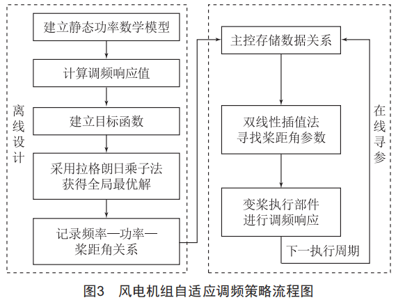 傳統(tǒng)調(diào)頻控制策略雖然能提供風(fēng)電調(diào)頻政策標(biāo)準(zhǔn)所要求的頻率支撐能力,但由此導(dǎo)致的風(fēng)電機(jī)組運(yùn)行效益低和發(fā)電量損失大的問(wèn)題卻不能很好地解決,因此設(shè)計(jì)風(fēng)電機(jī)組自適應(yīng)調(diào)頻控制策略很有必要。本文所設(shè)計(jì)的調(diào)頻自適應(yīng)控制策略主要由離線設(shè)計(jì)與在線尋參兩部分構(gòu)成,如圖3所示,具體實(shí)現(xiàn)步驟如下。