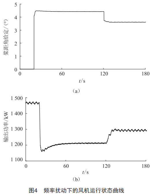 為驗(yàn)證上述控制器求解參數(shù)及本文控制策略的有效性,下文在風(fēng)機(jī)不同風(fēng)況、不同功率運(yùn)行點(diǎn)進(jìn)行仿真驗(yàn)證。首先設(shè)定電網(wǎng)初始頻率為50Hz,風(fēng)速為恒定風(fēng)速9m/s。在20s時(shí)風(fēng)機(jī)開(kāi)啟調(diào)頻自適應(yīng)控制策略進(jìn)行調(diào)頻功率備用,在120s時(shí)電網(wǎng)頻率下擾至49.8Hz,該策略通過(guò)雙線性插值法進(jìn)行在線尋參工作發(fā)揮穩(wěn)定的功率支撐作用。從圖4可以看出,在20s時(shí)獎(jiǎng)距角增大進(jìn)行減載備用,穩(wěn)定后風(fēng)機(jī)輸出功率降低250kw左右,使其長(zhǎng)期保持0.1Pn的調(diào)頻能力。在120s時(shí),風(fēng)機(jī)通過(guò)雙線性插值法計(jì)算后減小獎(jiǎng)距角,增大輸出功率約75kw左右,滿足調(diào)頻標(biāo)準(zhǔn)要求。