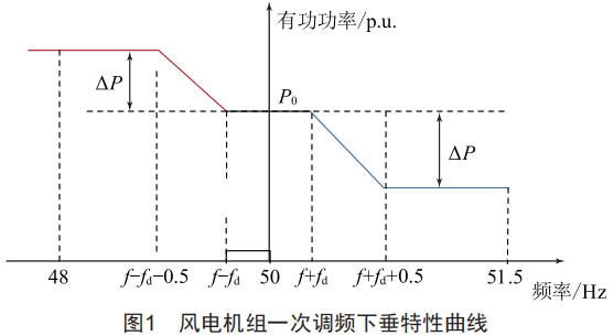 風(fēng)電在整個(gè)電力系統(tǒng)中的占比不斷上升,因此各地政策標(biāo)準(zhǔn)要求風(fēng)力發(fā)電具備參與一次調(diào)頻能力。在電網(wǎng)頻率變化超過(guò)一定范圍時(shí),風(fēng)電機(jī)組需按照預(yù)設(shè)的下垂特性曲線自動(dòng)增加或降低風(fēng)電機(jī)組出力來(lái)參與系統(tǒng)一次調(diào)頻,風(fēng)電機(jī)組一次調(diào)頻下垂特性曲線如圖1所示。
