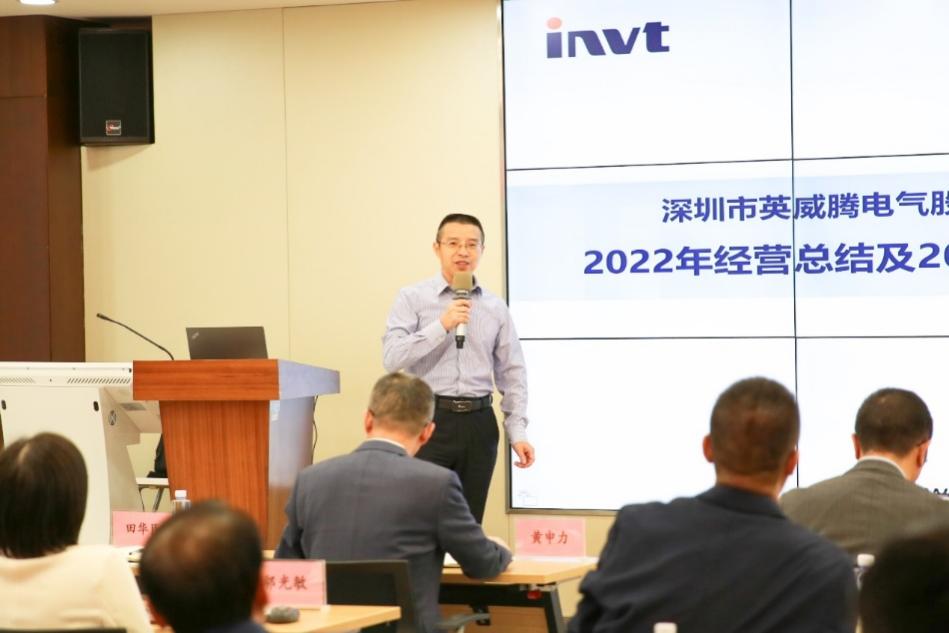 總裁田華臣先生發(fā)布2023-2025年英威騰戰(zhàn)略全景圖,詳細(xì)闡述了未來三年公司戰(zhàn)略與企業(yè)文化。同時(shí)對2022年進(jìn)行總結(jié),提出2023年總體經(jīng)營方針——“迎勢而上、鑄造核心、構(gòu)建未來、行以致遠(yuǎn)”。