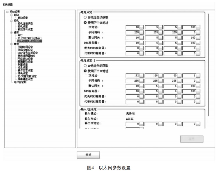 系統(tǒng)重啟完成以后重新點(diǎn)擊"系統(tǒng)設(shè)置"菜單,選中"以太網(wǎng)(無協(xié)議(UDP))"選項(圖4),在這個選項中會有IP地址以及端口等參數(shù)設(shè)置。這里需要注意的是兩個IP地址參數(shù),需要填寫"地址設(shè)定2"中的參數(shù),需要填入的信息有視覺控制器的IP地址、子網(wǎng)掩碼、默認(rèn)網(wǎng)關(guān)和DNS服務(wù)器等。