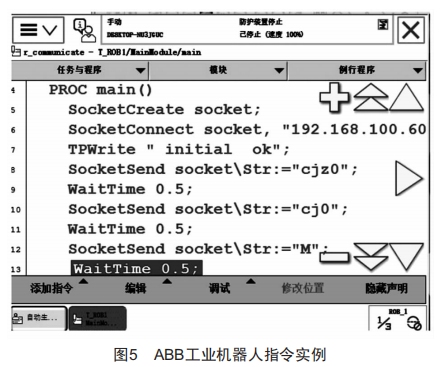 下一步使用SocketCreate機(jī)器人指令創(chuàng)建一個使用流型協(xié)議TCP/IP的新套接字,并分配到相應(yīng)變量(圖5)。緊接著使用SocketConnect指令將套接字與遠(yuǎn)程計算機(jī)進(jìn)行連接。通信連接完成以后需要發(fā)送及接收視覺系統(tǒng)的信息。發(fā)送信息采用SocketSend指令向遠(yuǎn)程計算機(jī)發(fā)送數(shù)據(jù)指令。當(dāng)經(jīng)過視覺系統(tǒng)采集信息和判斷后,工業(yè)機(jī)器人系統(tǒng)將接收來自遠(yuǎn)程計算機(jī)的數(shù)據(jù),接收數(shù)據(jù)采用SocketReceive指令來完成,該指令在接收數(shù)據(jù)的同時把數(shù)據(jù)存儲到相應(yīng)的字符串變量中。在接收的數(shù)據(jù)信息中需要提取有用信息,這就需要StrPart尋找指定字符位置指令,從字符串中提取指定位置的數(shù)據(jù),并將結(jié)果賦值給新的字符串變量。最后,當(dāng)不使用套接字連接時,使用SocketCloSe來關(guān)閉。