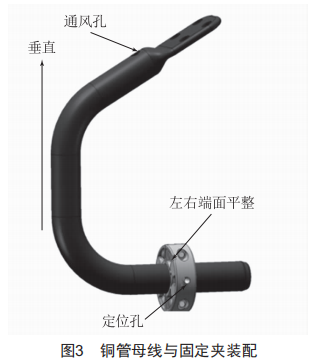 本設(shè)計(jì)的銅管母線端部設(shè)有通風(fēng)孔,形成了熱空氣對(duì)流通道,并從結(jié)構(gòu)上實(shí)現(xiàn)了將母線與靜觸頭融為一體,避免了傳統(tǒng)方案兩者連接時(shí)所產(chǎn)生的較大的接觸電阻,從而減少了發(fā)熱。此外,銅管母線上設(shè)計(jì)有定位孔,用于與配套的母線固定夾進(jìn)行固定限位,保證銅排垂直度,其結(jié)構(gòu)如圖3所示。