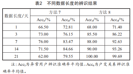 以數(shù)據(jù)長度7天為例說明計算方式,設(shè)定時間窗窗寬為7×24個數(shù)據(jù)點,以固定窗寬的滑動窗隨機抽取時序數(shù)據(jù)進行戶變關(guān)系辨識,重復(fù)50次統(tǒng)計辨識結(jié)果的平均值,結(jié)果如表2所示。