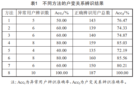 經(jīng)核查,臺區(qū)A、B的戶變關(guān)系信息正確。為了驗證所提戶變關(guān)系辨識法的計算效果,隨機抽取2個臺區(qū)共10個用戶,將其臺賬檔案調(diào)整至另一臺區(qū),并選擇8種方法分別進行配網(wǎng)臺區(qū)戶變關(guān)系辨識,對比不同方法的辨識效果。其中,方法1和方法2為基于K-means算法的戶變關(guān)系辨識法,分別采用歐氏距離和皮爾遜相關(guān)系數(shù)度量樣本相似性:方法3和方法4為基于自動編碼器和K-means算法的戶變關(guān)系辨識法,分別采用歐氏距離和皮爾遜相關(guān)系數(shù)度量樣本相似性:方法5和方法6為基于t分布隨機近鄰嵌入和K-means算法的戶變關(guān)系辨識法,分別采用歐氏距離和皮爾遜相關(guān)系數(shù)度量樣本相似性:方法7和方法8為基于多分辨率分析和K-means算法的戶變關(guān)系辨識法,分別采用多分辨率距離和多分辨率相似度度量樣本相似性。8種方法辨識結(jié)果如表1所示。